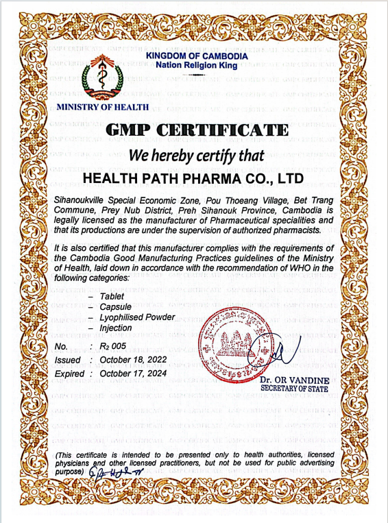 Health Path Pharma Co., Ltd is an internationally well-recognized manufacturing company with a 40,000 sq ft headquarter based in Cambodia and a total of 2 global GMP manufacturing sites and 2 R&D centers worldwide.having more than 150 staffs including top professionals with strong Biotech industry background.
